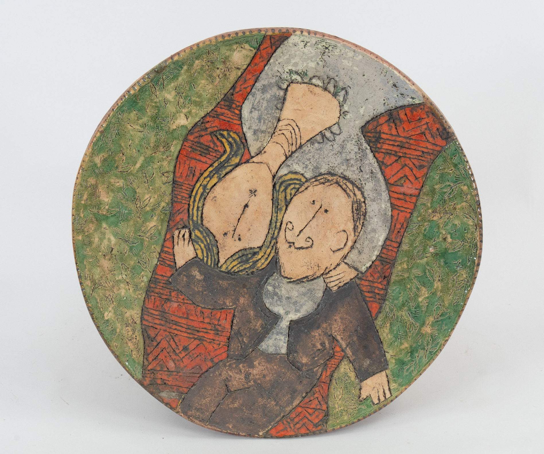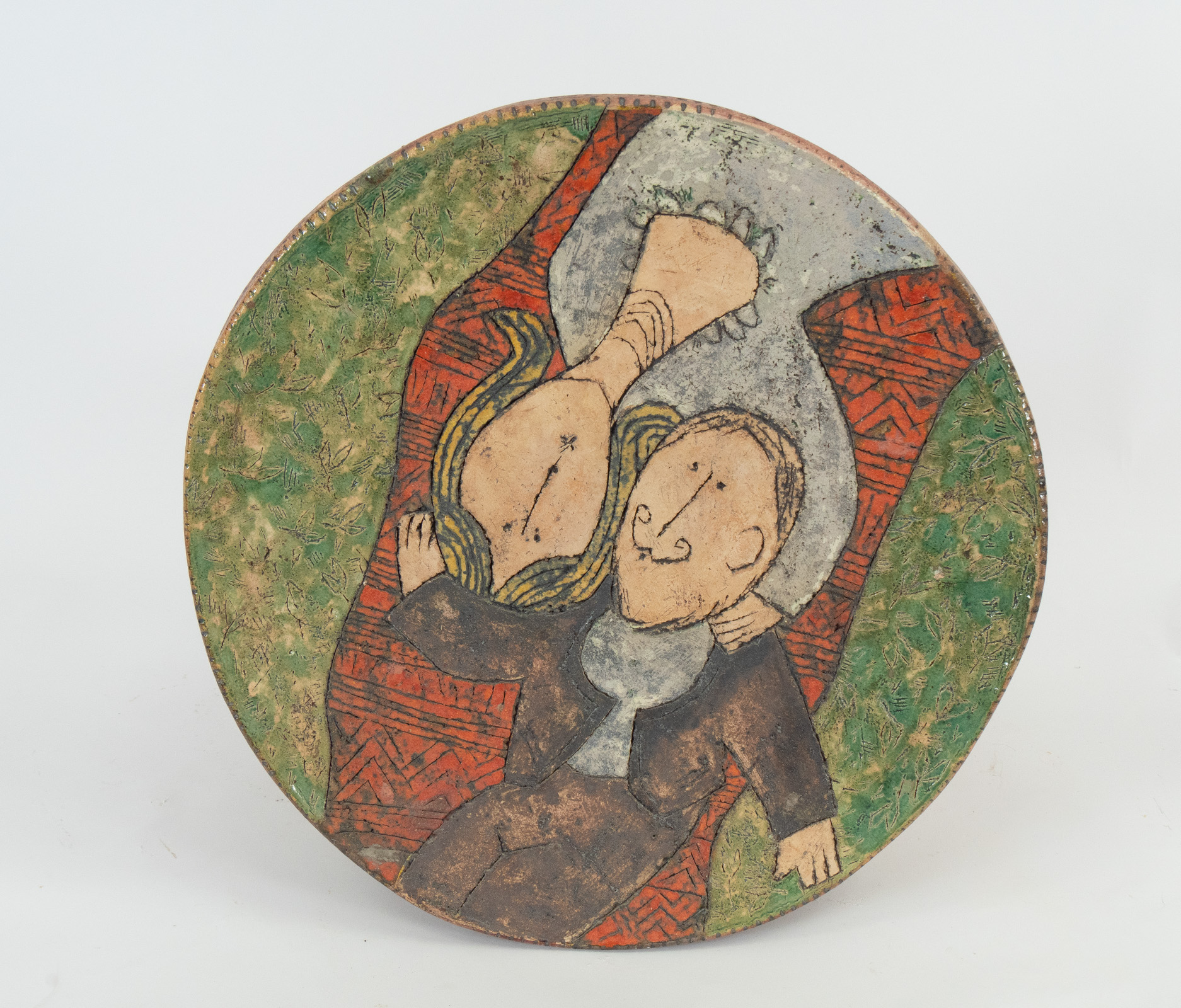 Πιάτο που απεικονίζει ζεύγος. Πηλός stoneware, οξείδια, σμάλτα, θερμοκ. 1100*, τόπος παραγωγής: Βόλος 2009.